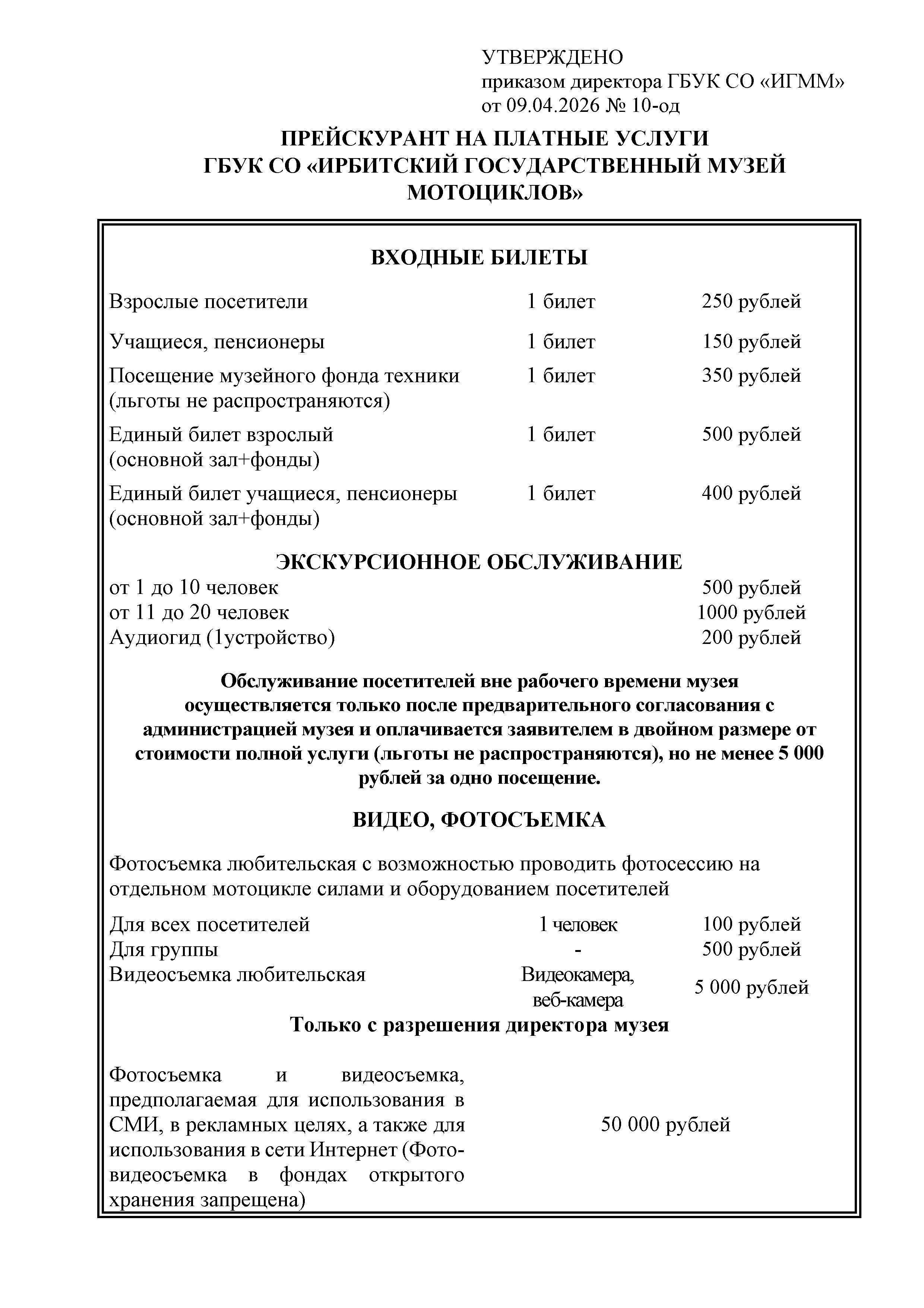 Приказ 10-од от 09.04.2026г. "Об утверждении прейскуранта на платные услуги"